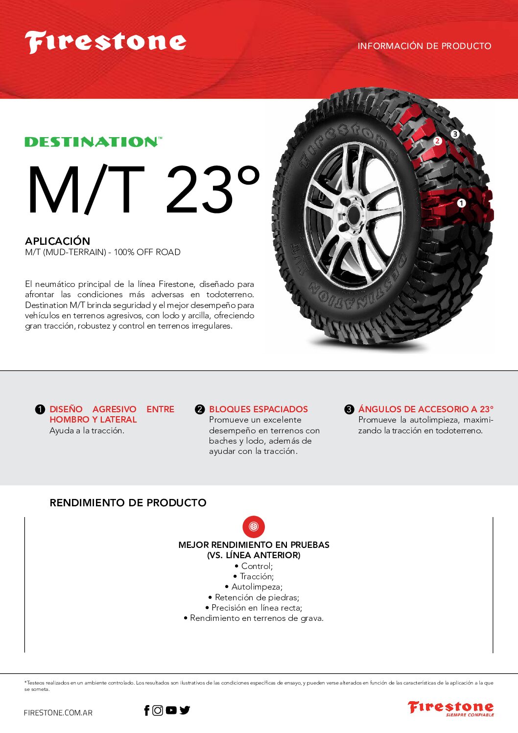 El Firestone Destination MT23 está diseñado para aventuras todoterreno, ofreciendo durabilidad, tracción superior y confort en terrenos difíciles como barro y roca.