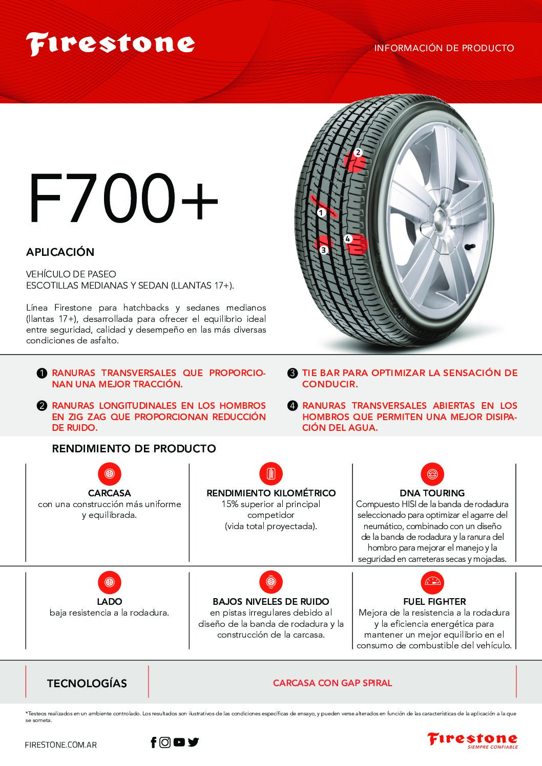El Firestone F700+ está diseñado para sedanes y hatchbacks de segmento medio, ofreciendo el balance ideal entre seguridad, calidad y rendimiento en diversas condiciones de suelo.